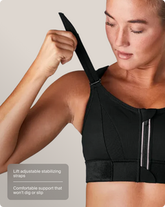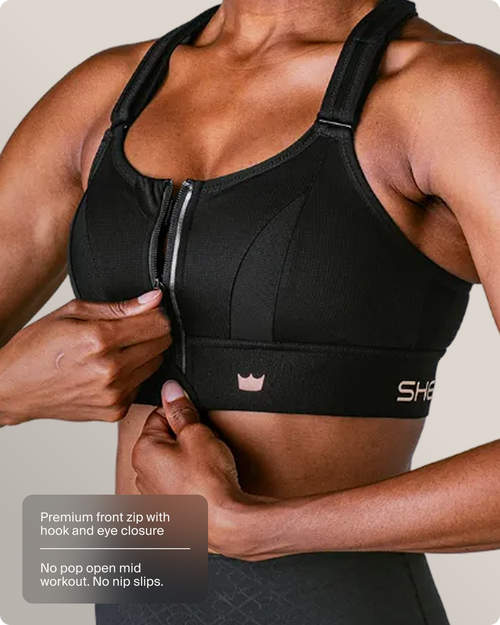 The last thing you want is to peel a sweaty bra off over your head. Our ultra-durable zipper and hook-and-eye make exits easy and securely stay put while you move.